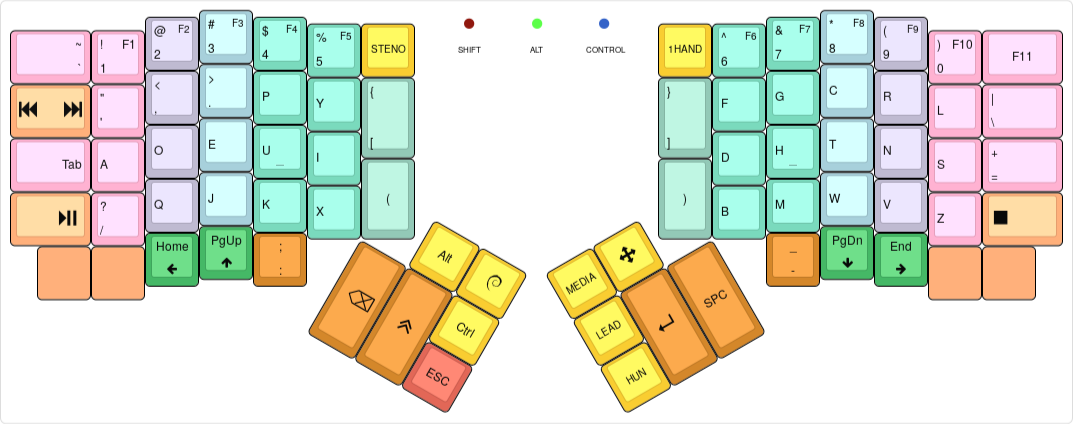 • The Media, Arrow, and Hun layer keys are one-shot, the 1Hand and STENO keys are toggles.