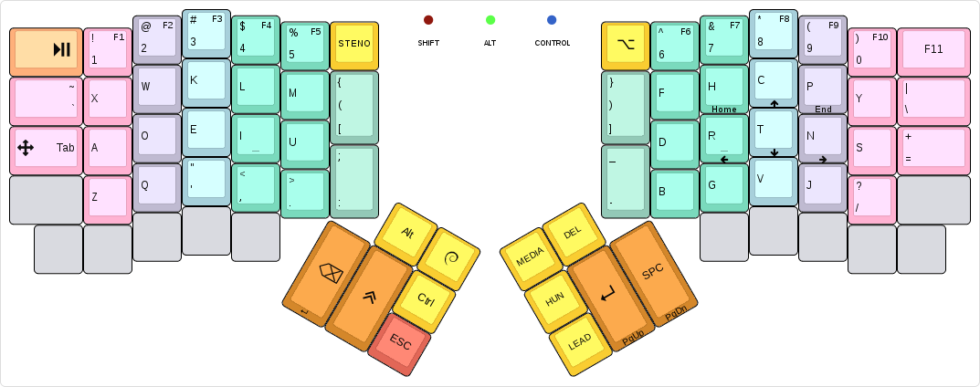 Major changes include: * The **1HAND** layer has been removed. * A `Delete` key is now available on the right thumb cluster. * The **ADORE** layer received a major update, see the updated layout image. * It is now possible to enable automatic logging for the **ADORE** layer, by setting the `ADORE_AUTOLOG` makefile variable to `yes` when compiling the keymap. It is off by default. * The `~` key and the `Media Next/Prev` key have been swapped on the **base** layer. * On the **ARROW** layer, `Backspace` has been replaced by `Enter`. * There is some experimental support for entering Unicode symbols. Signed-off-by: Gergely Nagy <algernon@madhouse-project.org>