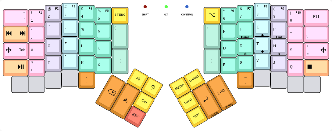 This updates my ErgoDox EZ layout to v1.3, which has the following noteworthy changes: * Added support for logging keys, by pressing `LEAD d`. Also included is a tool to generate a **heatmap** out of the logs. * The arrow and navigation keys were rearranged again, and now require an additional key being held to activate. See the **base layer** for an image that shows where arrows are. * The **experimental** layer has been redone, and is now called **ADORE**, and as such, can be enabled by `LEAD a` now. * Switching between Dvorak and ADORE is now persisted into EEPROM, and survives a reboot. Signed-off-by: Gergely Nagy <algernon@madhouse-project.org>