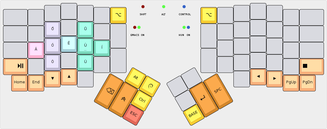 • The Emacs and Hun layer keys are one-shot, the 1Hand is a toggle.